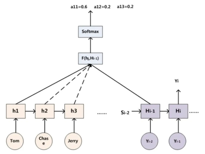 - Lx代表输入句子source的长度, a_ij代表在Target输出第i个单词时source输入句子中的第j个单词的注意力分配系数, 而hj则是source输入句子中第j个单词的语义编码, 假设Ci下标i就是上面例子所说的'汤姆', 那么Lx就是3, h1=f('Tom'), h2=f('Chase'),h3=f('jerry')分别输入句子每个单词的语义编码, 对应的注意力模型权值则分别是0.6, 0.2, 0.2, 所以g函数本质上就是加权求和函数, 如果形象表示的话, 翻译中文单词'汤姆'的时候, 数学公式对应的中间语义表示Ci的形成过程类似下图3: