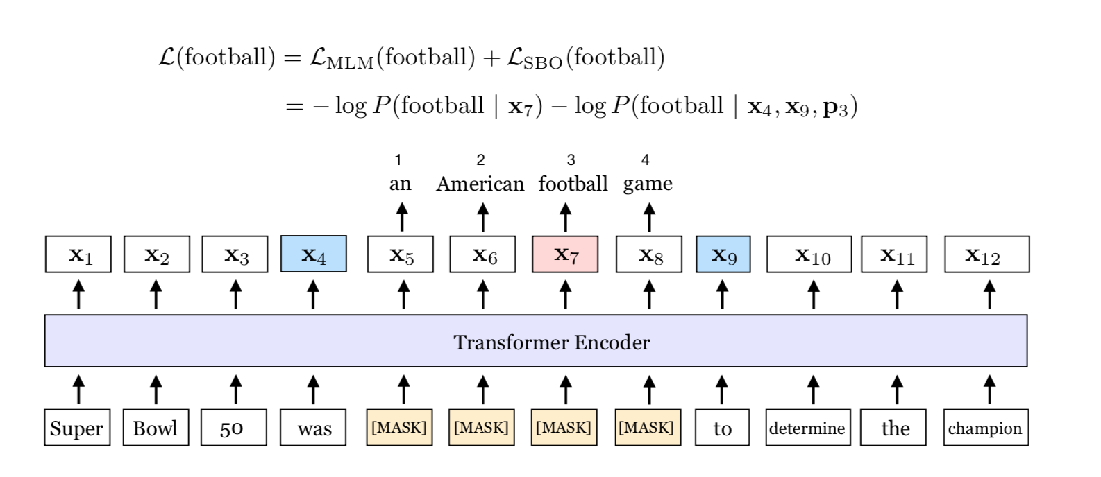 - 具体的做法: 在训练时取Span前后边界的两个词, 需要注意这两个词不在Span内, 然后用这两个词向量加上Span中被MASK掉的词的位置向量, 来预测原词.