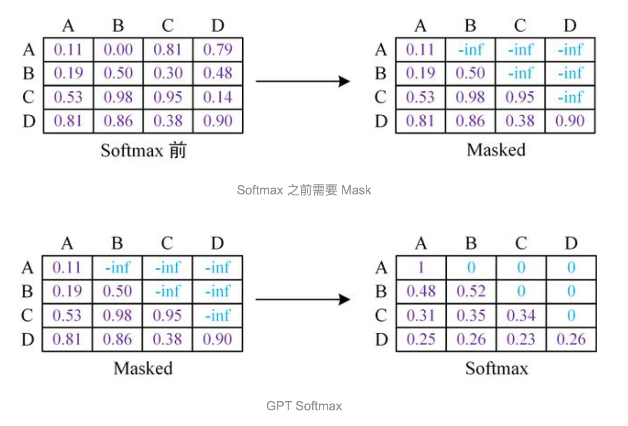 - 具体的遮掩操作是在slef-attention进行softmax之前进行的, 一般的实现是将MASK的位置用一个无穷小的数值-inf来替换, 替换后执行softmax计算得到新的结果矩阵. 这样-inf的位置就变成了0. 如上图所示, 最后的矩阵可以很方便的做到当利用A预测B的时候, 只能看到A的信息; 当利用[A, B]预测C的时候, 只能看到A, B的信息.